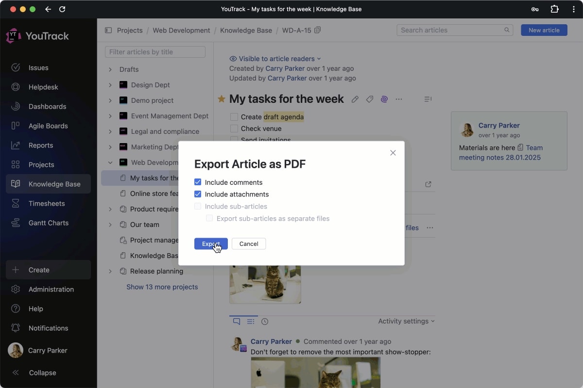 YouTrack 知识库中的 PDF 导出功能可以按原样导出所有内容,包括格式、链接、图像、列表等。 您甚至可以选择共享个别文章还是其所有子文章、评论和附件。 还提供了用于将内容导出为 Markdown 文件的选项。