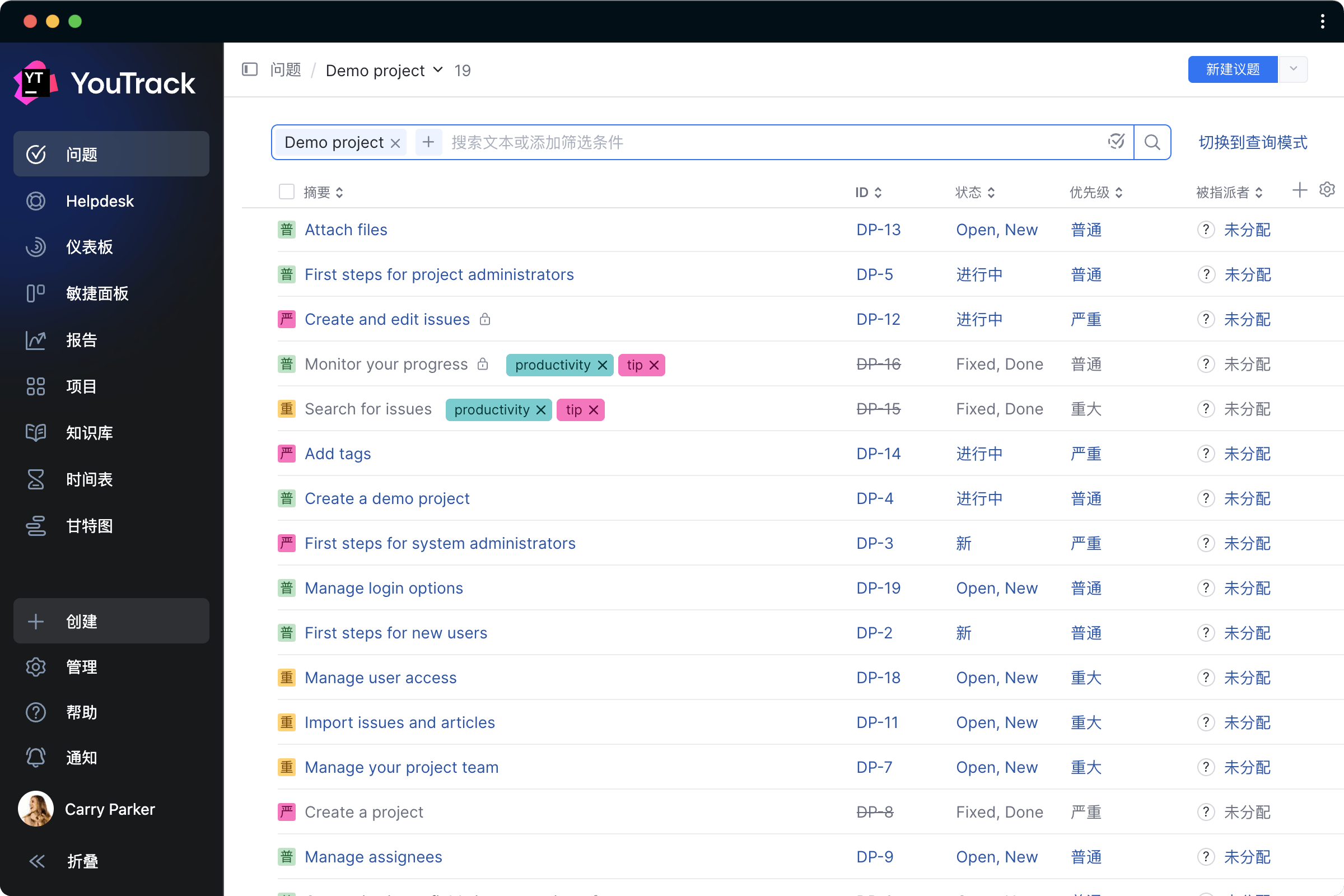 演示项目包含一些示例问题,有助于您熟悉 YouTrack 中的关键功能。 演示项目还包括一组敏捷面板和报告,以及一个示例仪表板。
