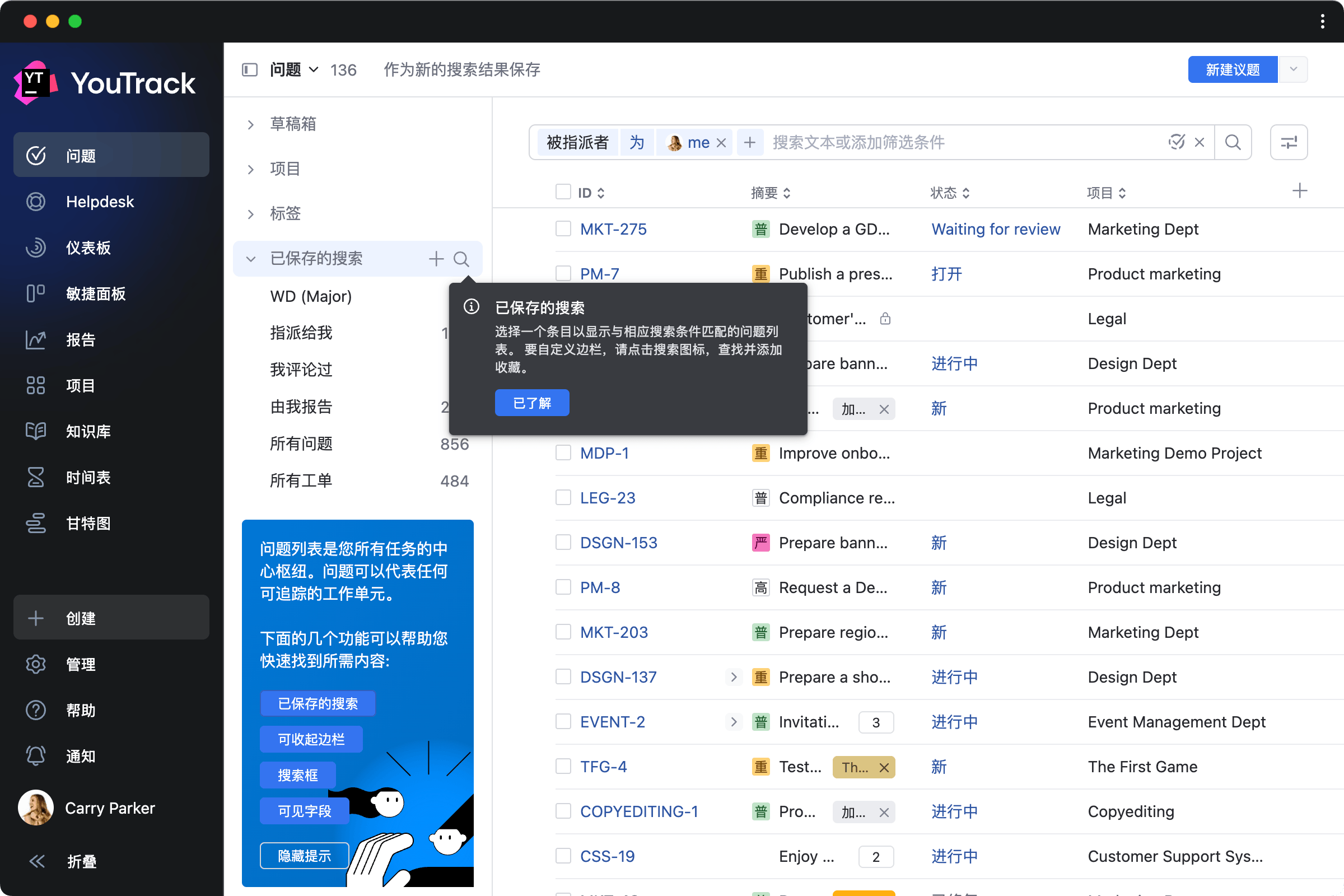 在帮助菜单中启用新用户提示即可向界面添加小提示,帮助新用户熟悉 YouTrack,还可以让有经验的用户探索他们不了解的功能。