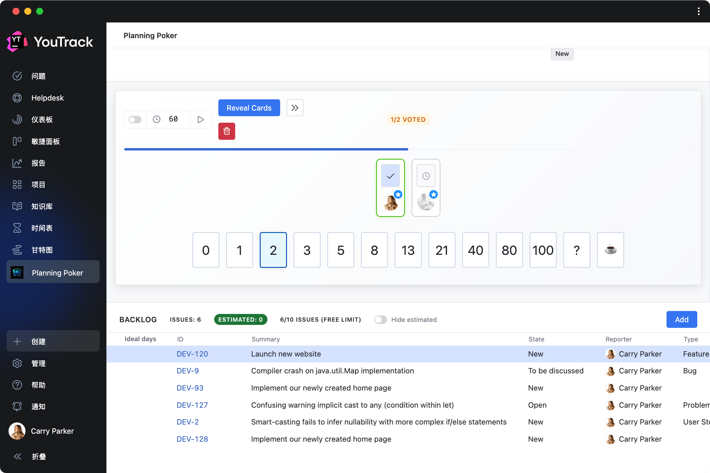 例如,Planning Poker Estimation 应用可以帮助将积压工作预估游戏化,并通过 YouTrack 菜单中的专用部分促进团队成员之间的实时规划。