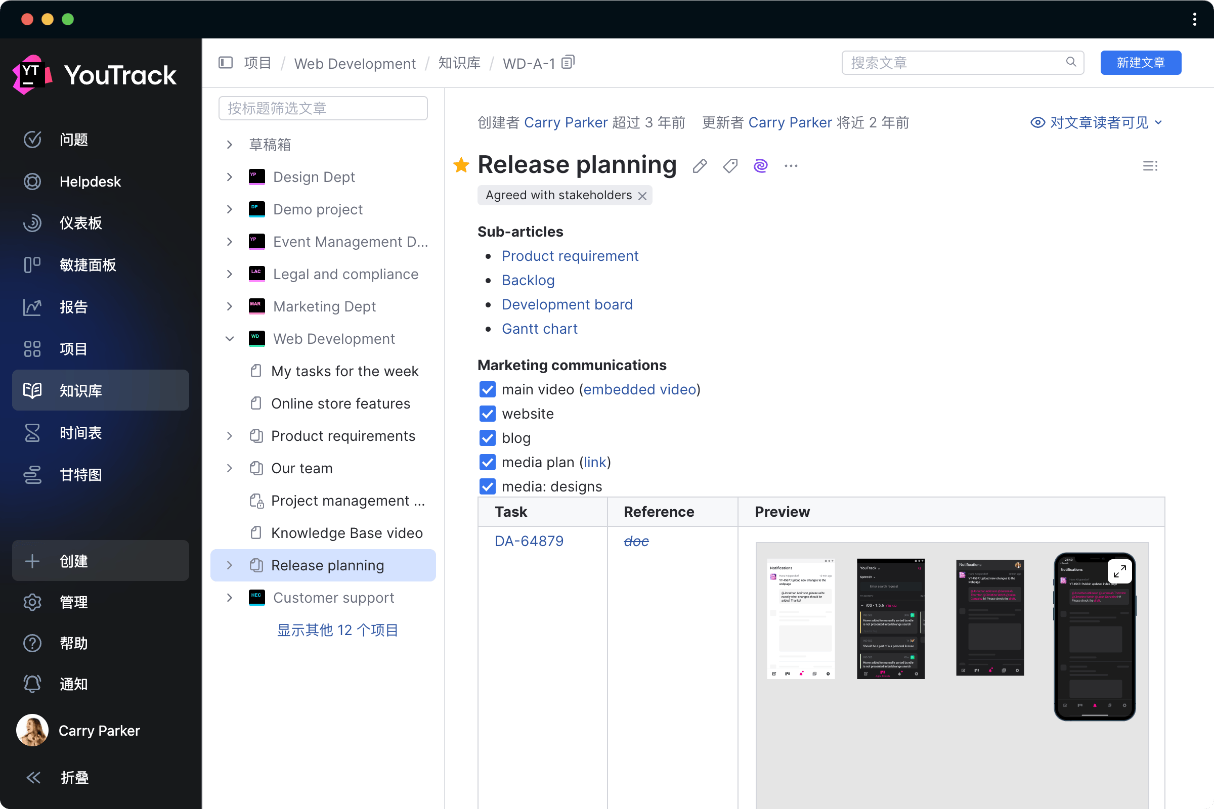 YouTrack 的内置知识库是收集和提炼要求、头脑风暴、安排任务和创建长期路线图的绝佳基础。