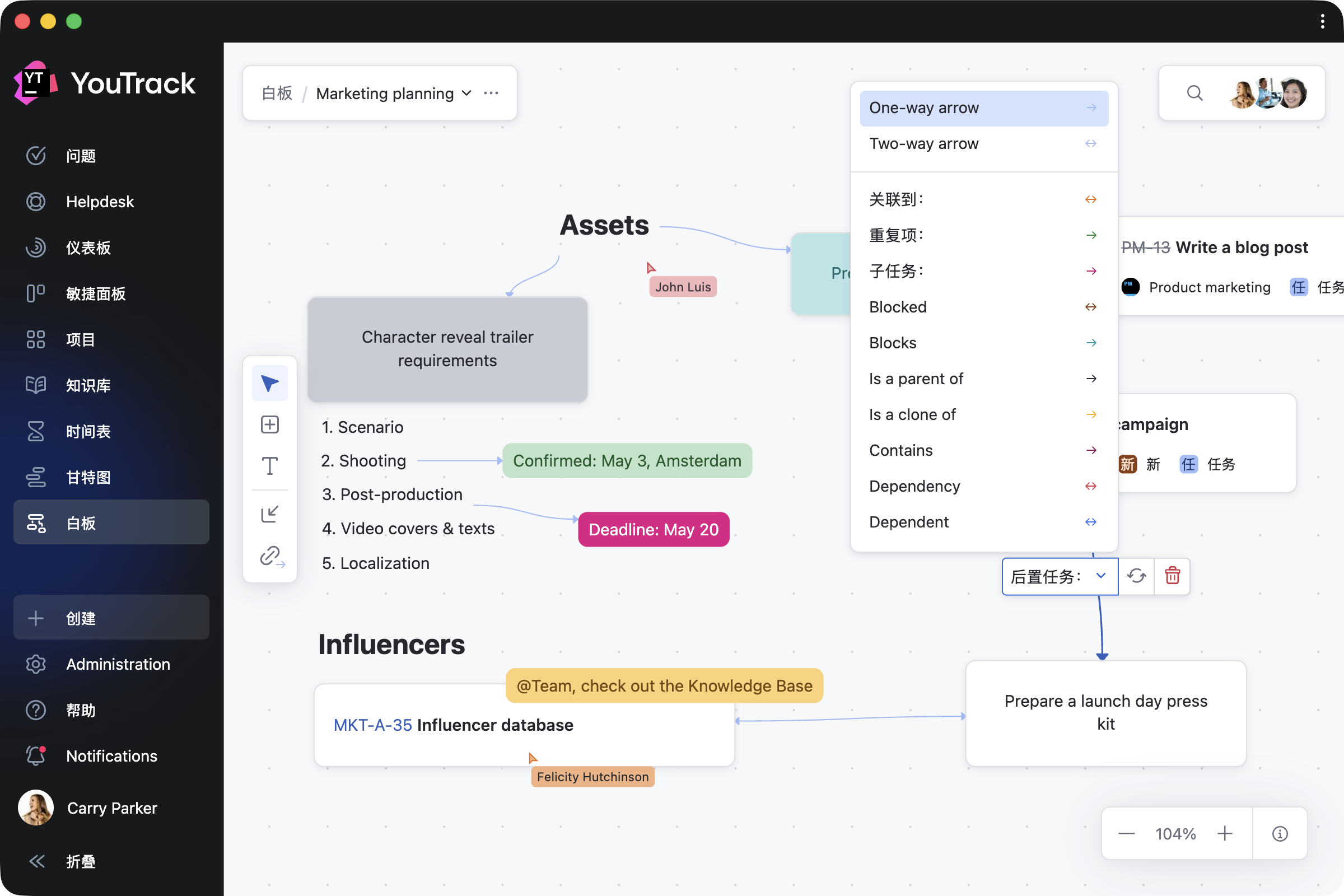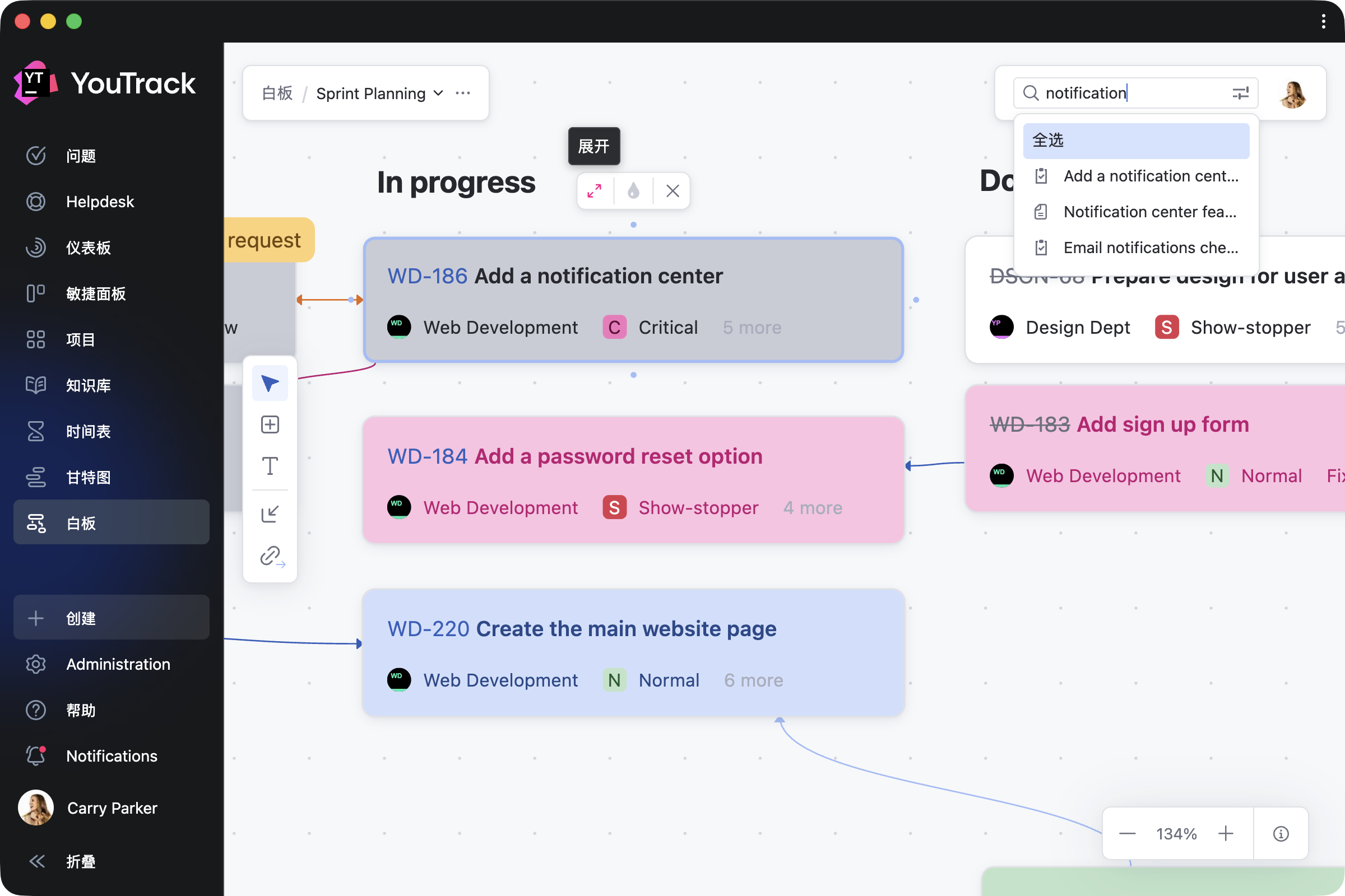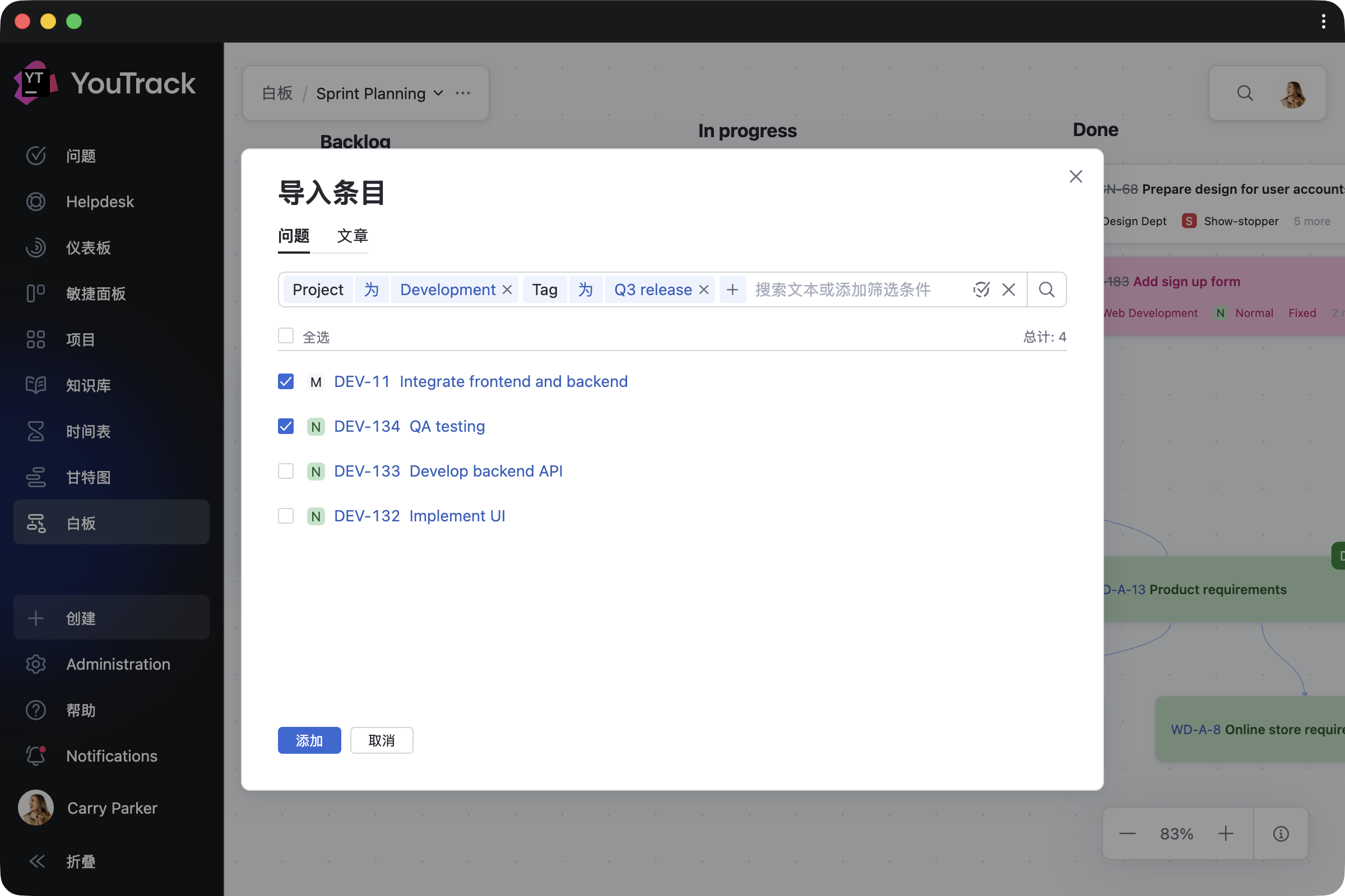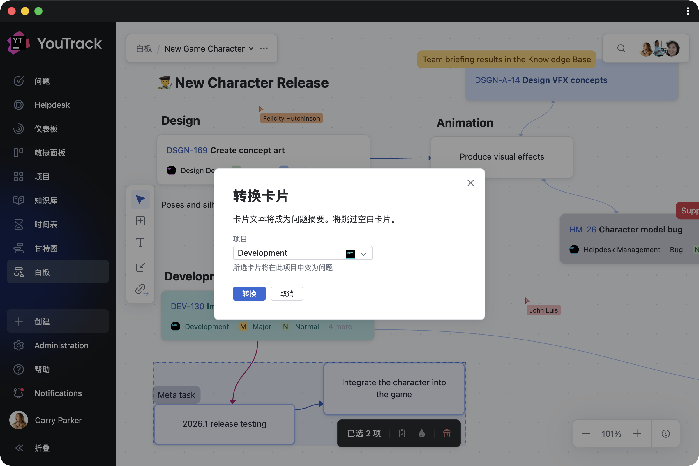 选择任意卡片、挑选相应项目、添加详细信息,即可见证它转化为真实的 YouTrack 问题或文章。 逐个转换条目,也可以在头脑风暴会议结束一次性转换。 任务依赖项将自动同步 – 无需额外操作。
