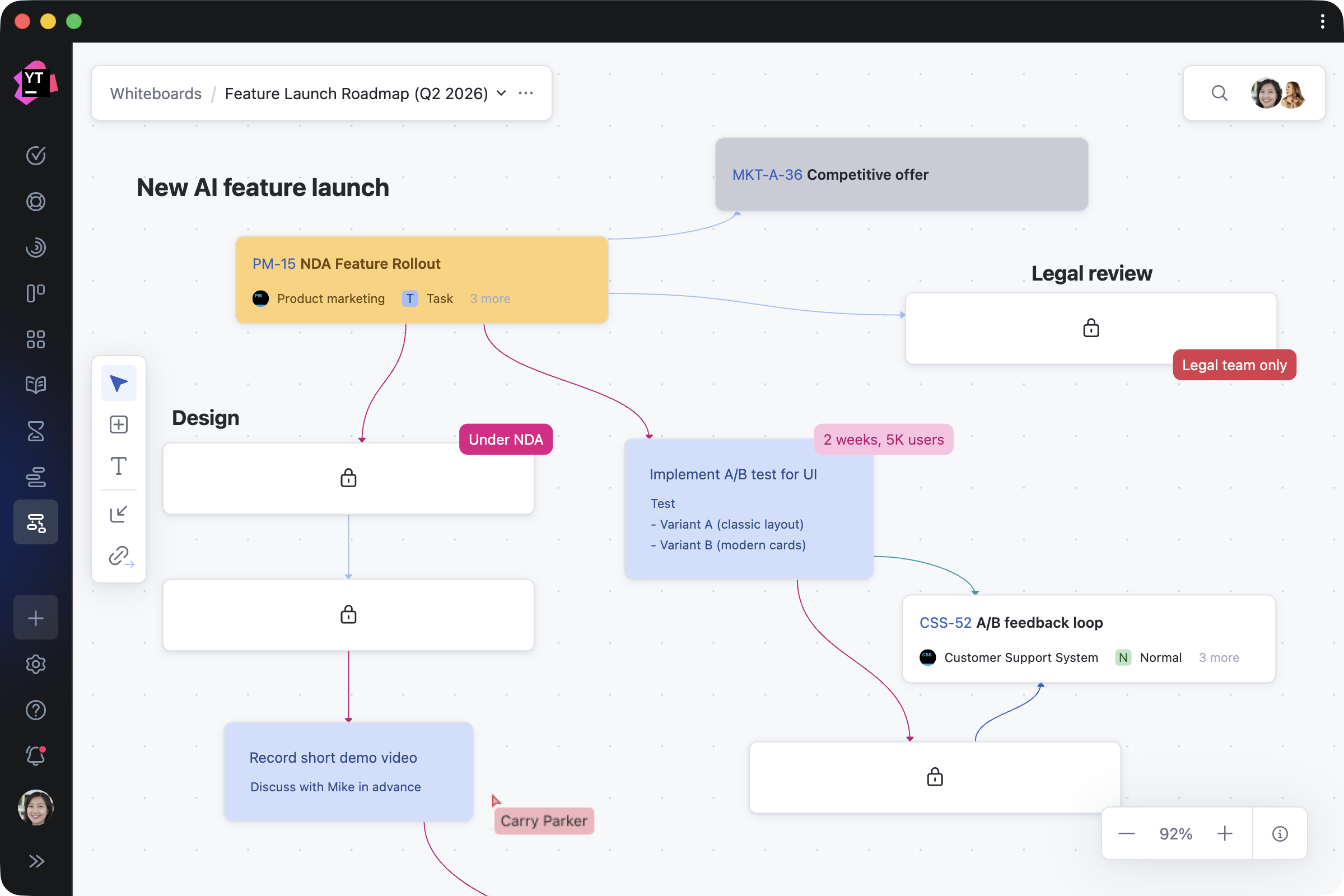 从空白画布开始 – 独自一人或与团队协作。 使用卡片与文本块拆解创意,通过链接将创意关联起来,并逐步搭建结构。 每一处更新都会即时呈现给所有成员。