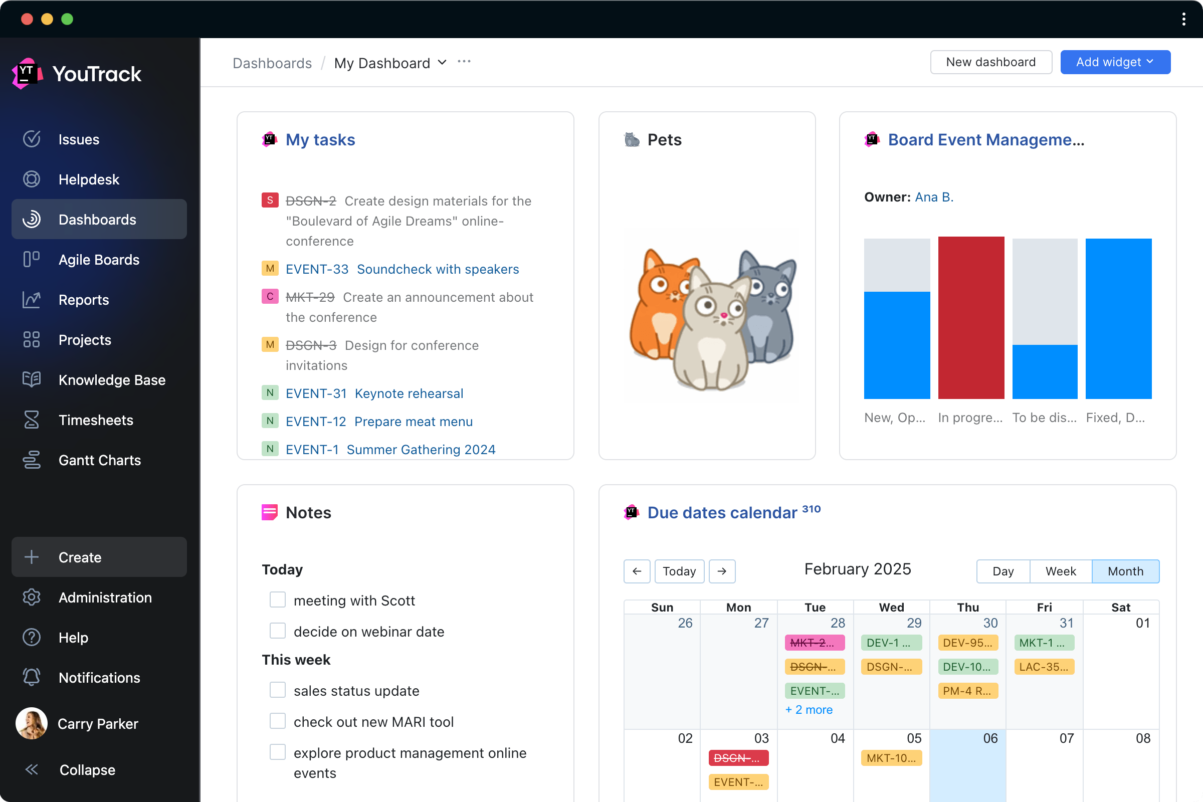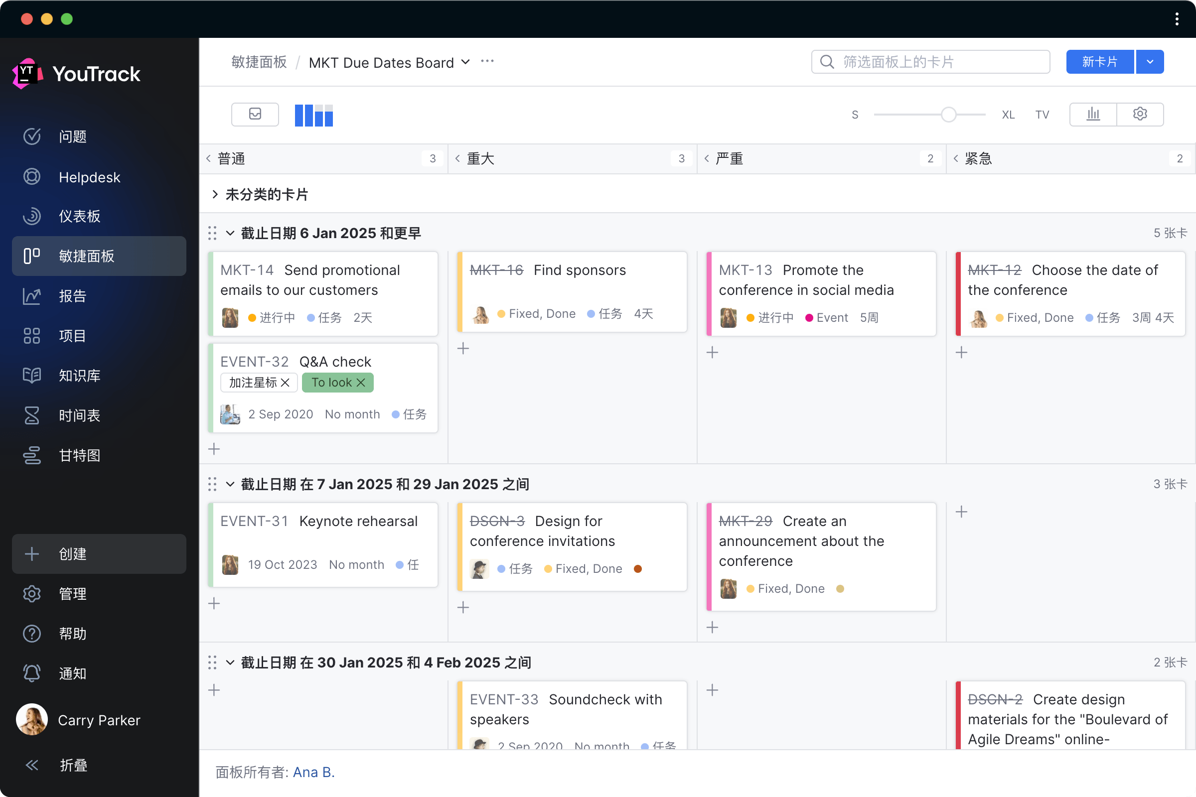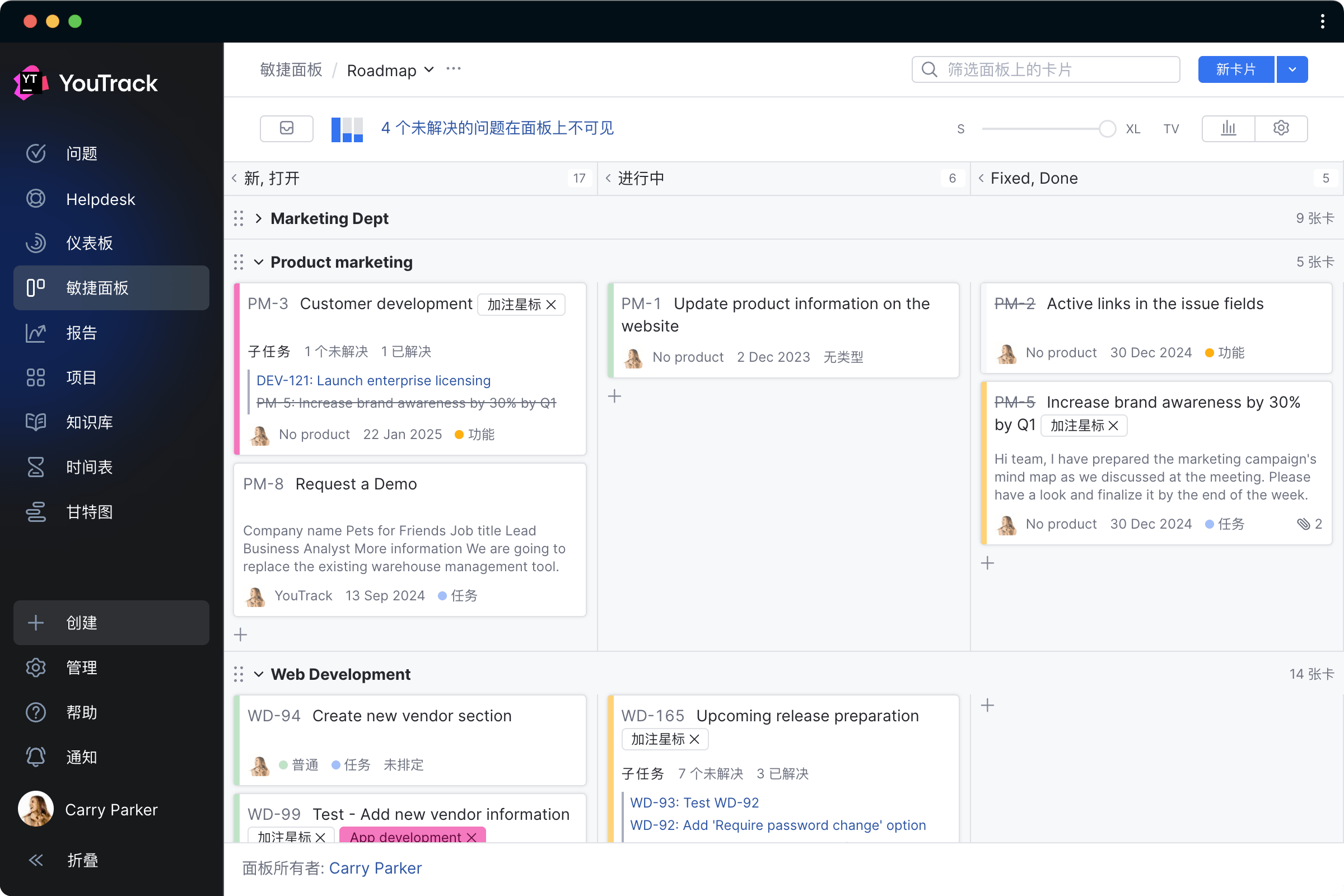 概览任务的当前状态并监视团队的进度。 在 YouTrack 中,您可以添加默认提供的微件,也可以添加自己的自定义微件。