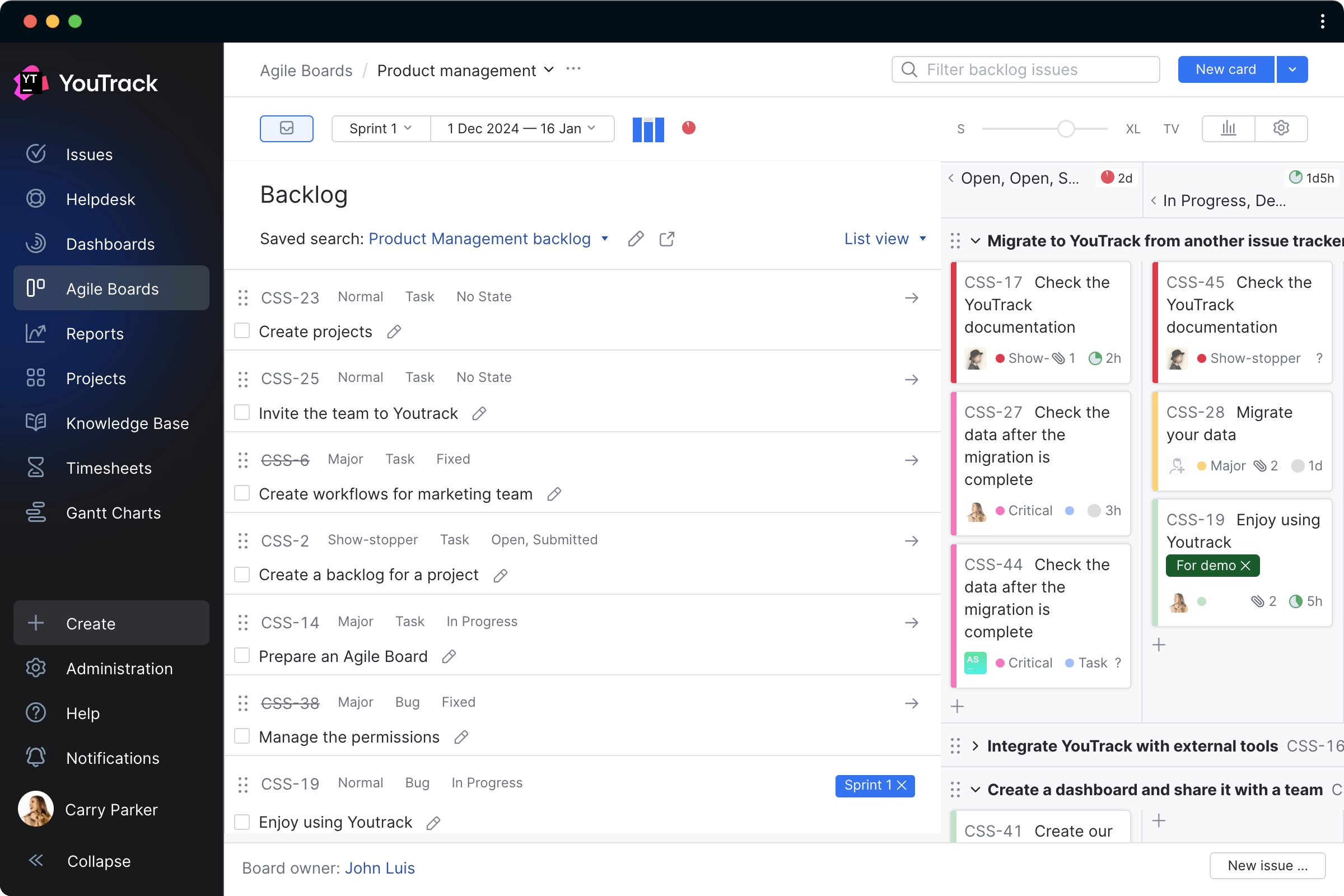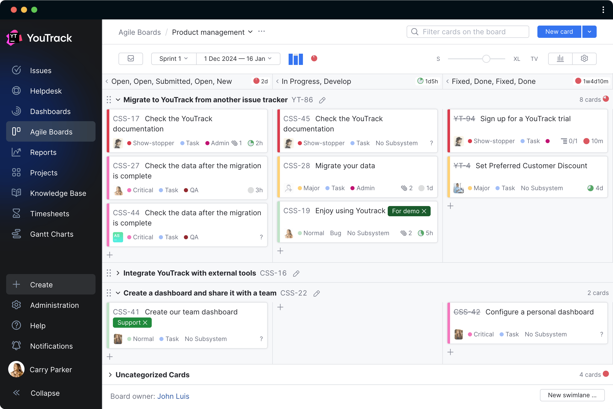 在 YouTrack 中的敏捷面板上组织您的流程。