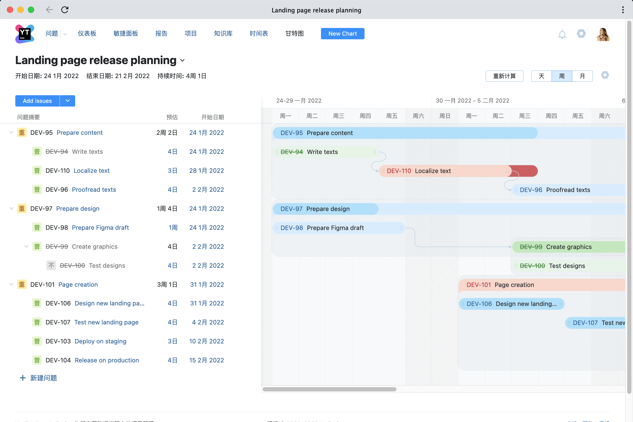 YouTrack 的交互式甘特图为项目经理提供了一个创建和管理项目计划的全面工具包。 直接在时间线上建立开始日期、添加完成到开始依赖项、设置估计和定义工作进行中约束,以获得对里程碑和项目完成日期的可靠预测。 当您的项目在进行时,您可以跟踪进度并更新任务,而不必离开甘特时间线。