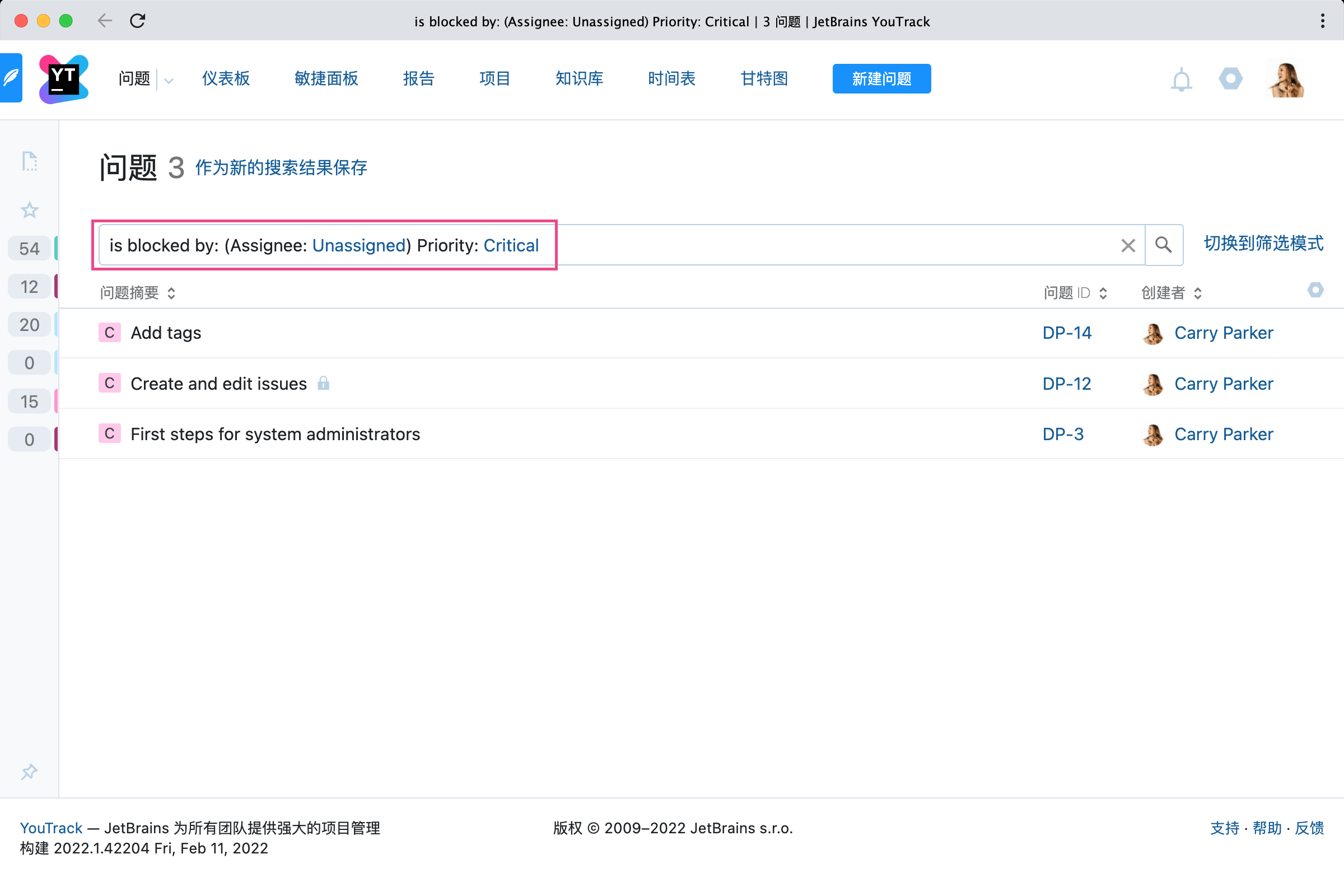 您现在可以搜索具有链接到目标问题的特定特性的问题。 例如,您可以检索某个问题未解决的子任务列表,或查找未分配的阻碍问题。
