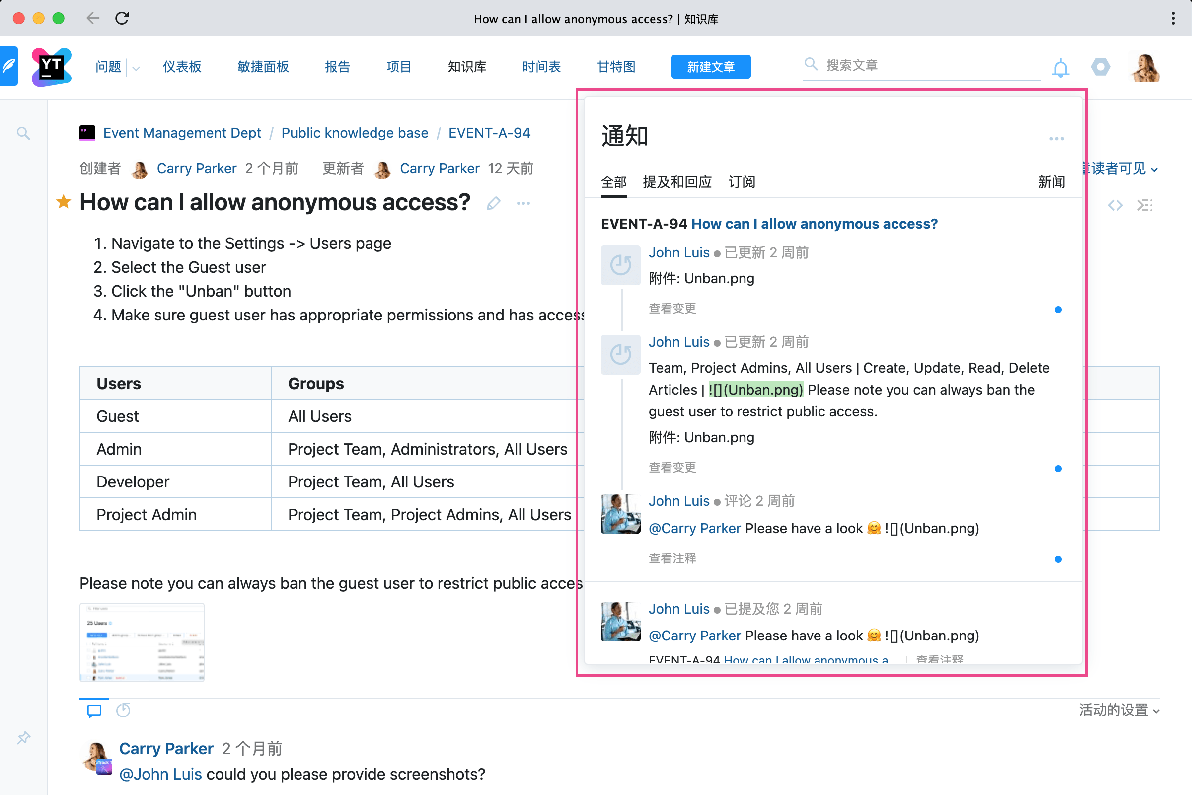 YouTrack 的通知中心现在可以通知您知识库文章的更新和其他活动。