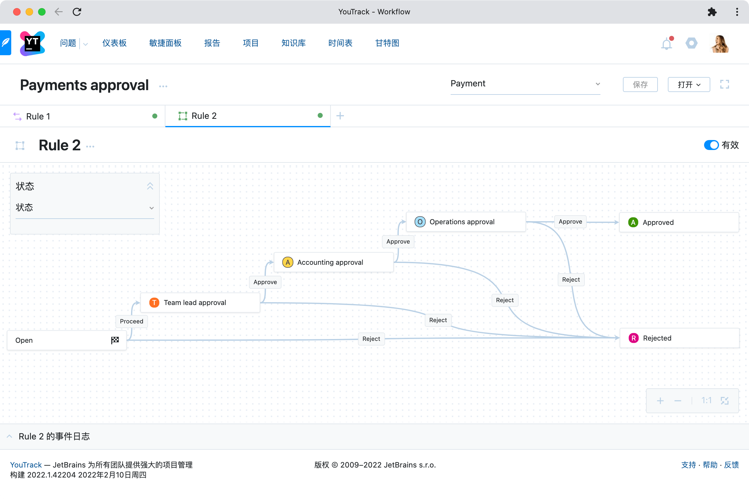 工作流构造器现在支持状态机规则,因此,您可以根据问题状态之间的转换定义流程图风格的流程,无需编写任何代码。 其他改进和新功能包括通知中心中的知识库更新、YouTrack Lite 中显示的 VCS 更改、LaTeX 表示法支持等。