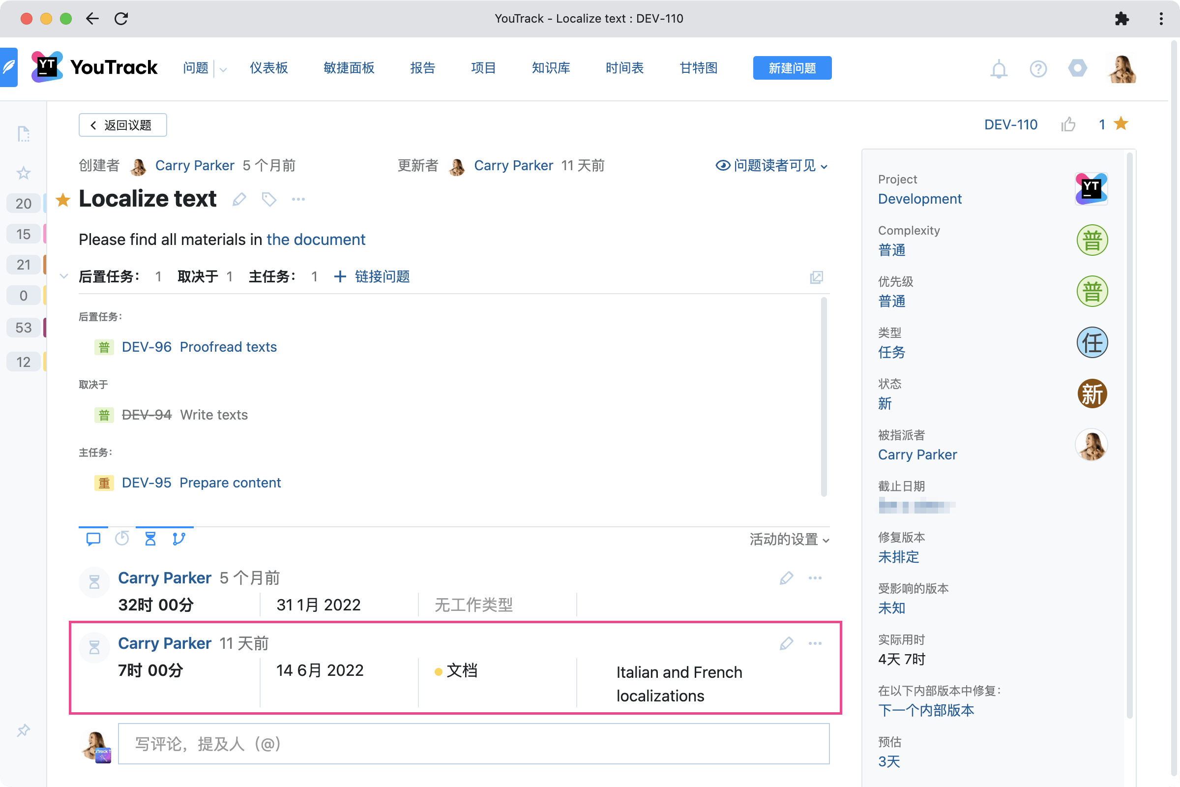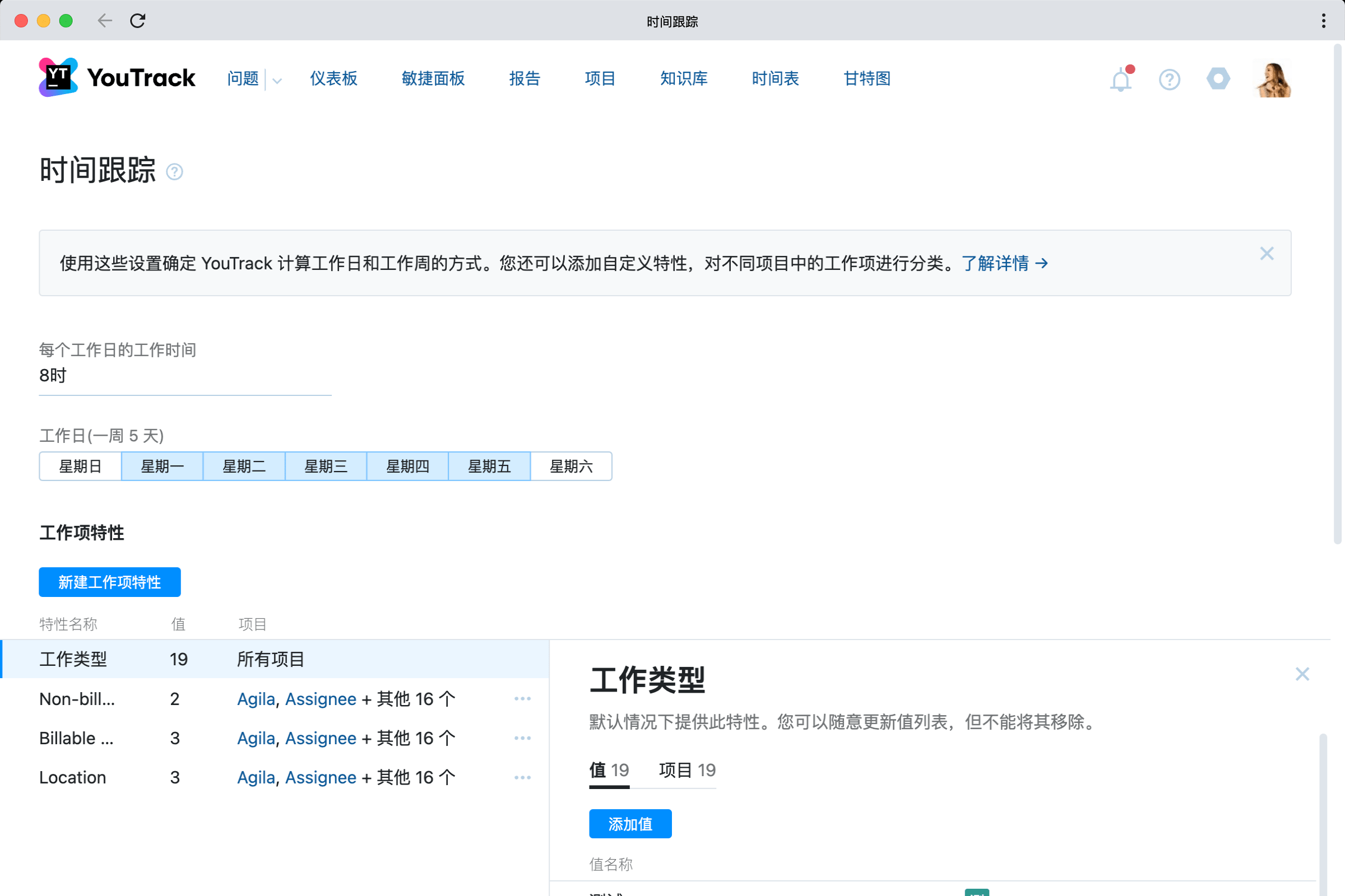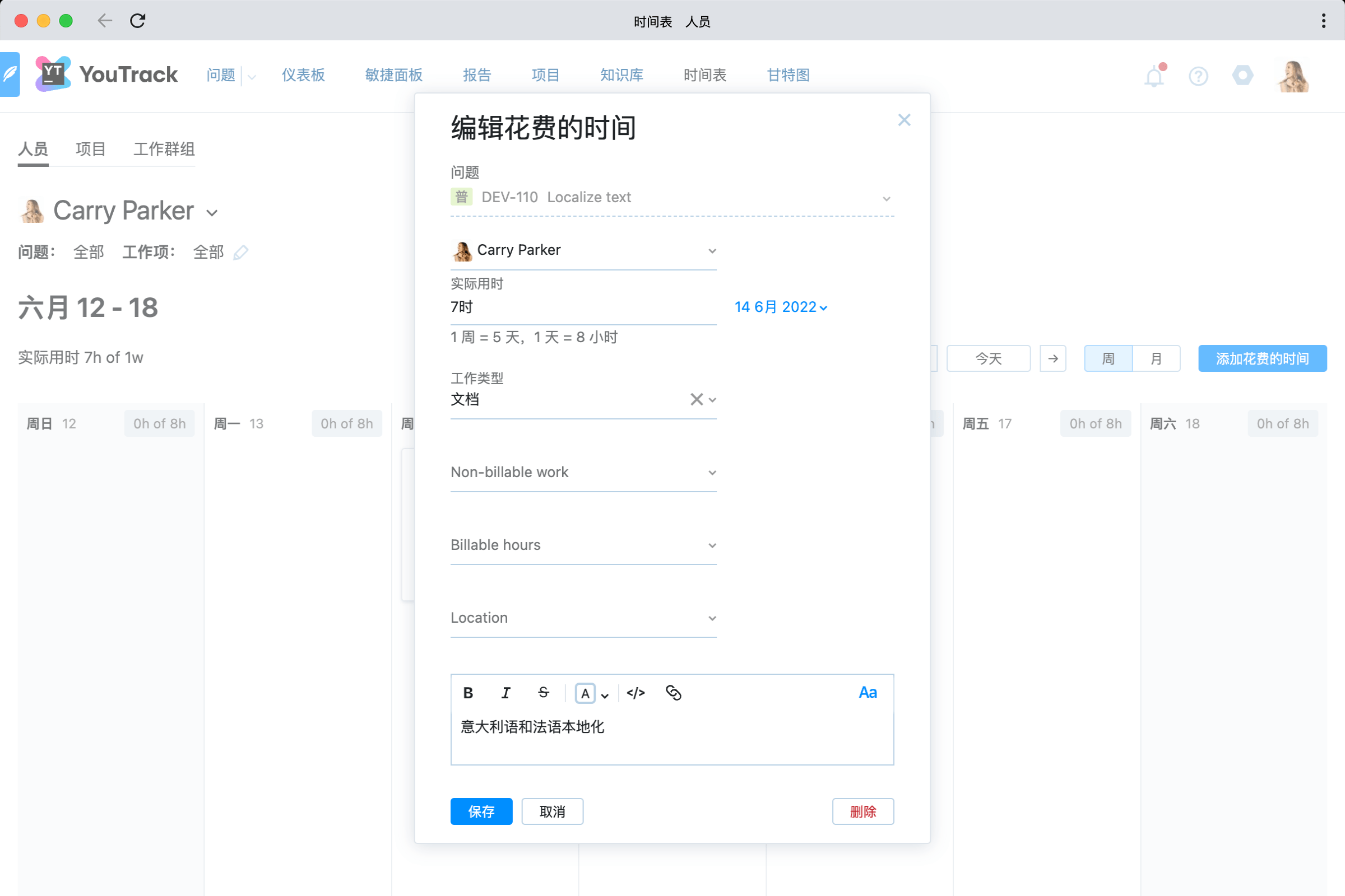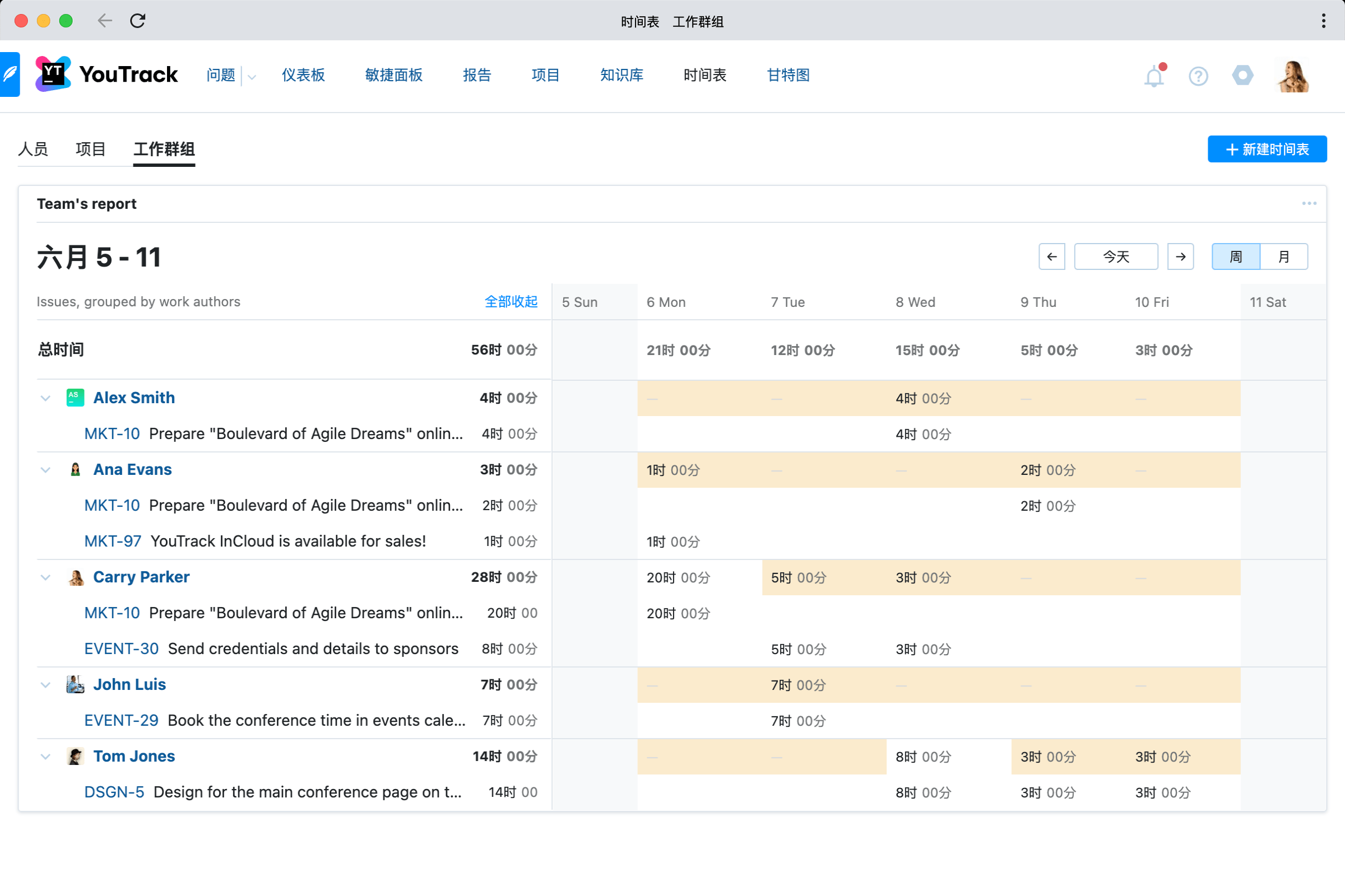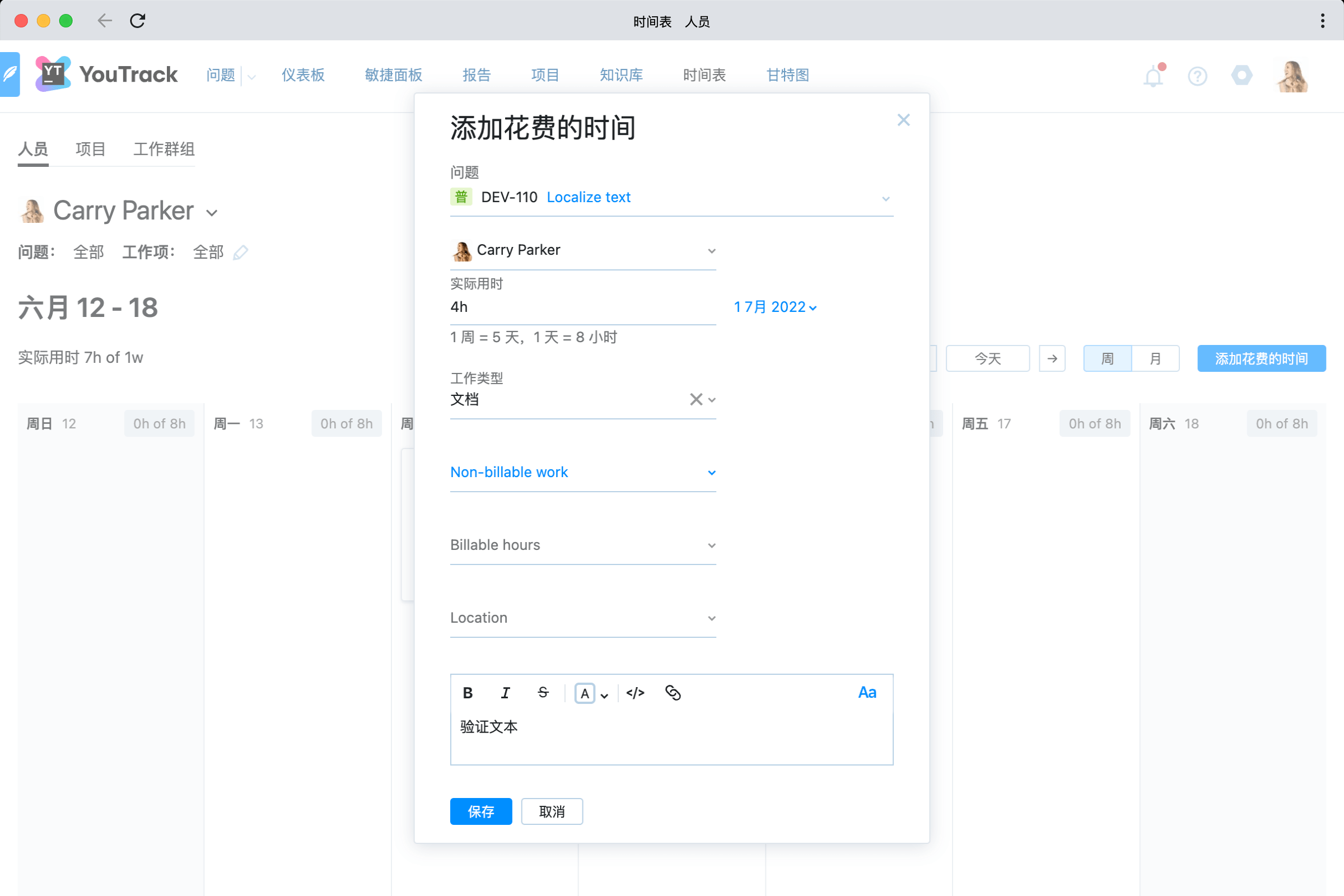 YouTrack 2022.2 提升了时间跟踪选项的功能和灵活性。 工作群组时间表有助于跟踪不同项目团队执行的工作。 使用工作项的自定义特性,您可以确定在团队成员将花费的时间添加到任务时要捕获的信息。