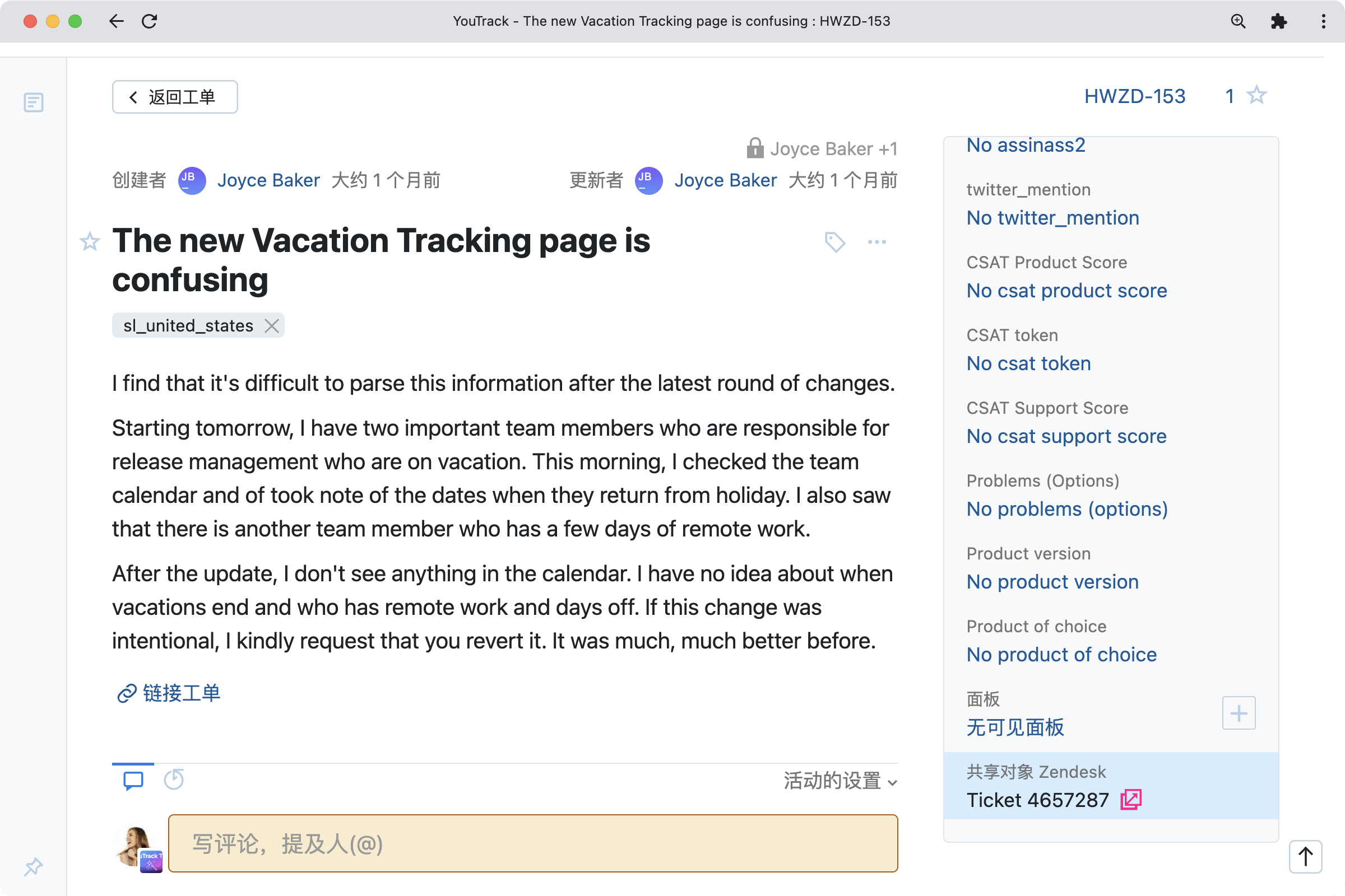 Zendesk 与 YouTrack 之间的集成有助于在两种工具之间保持客户通信同步。