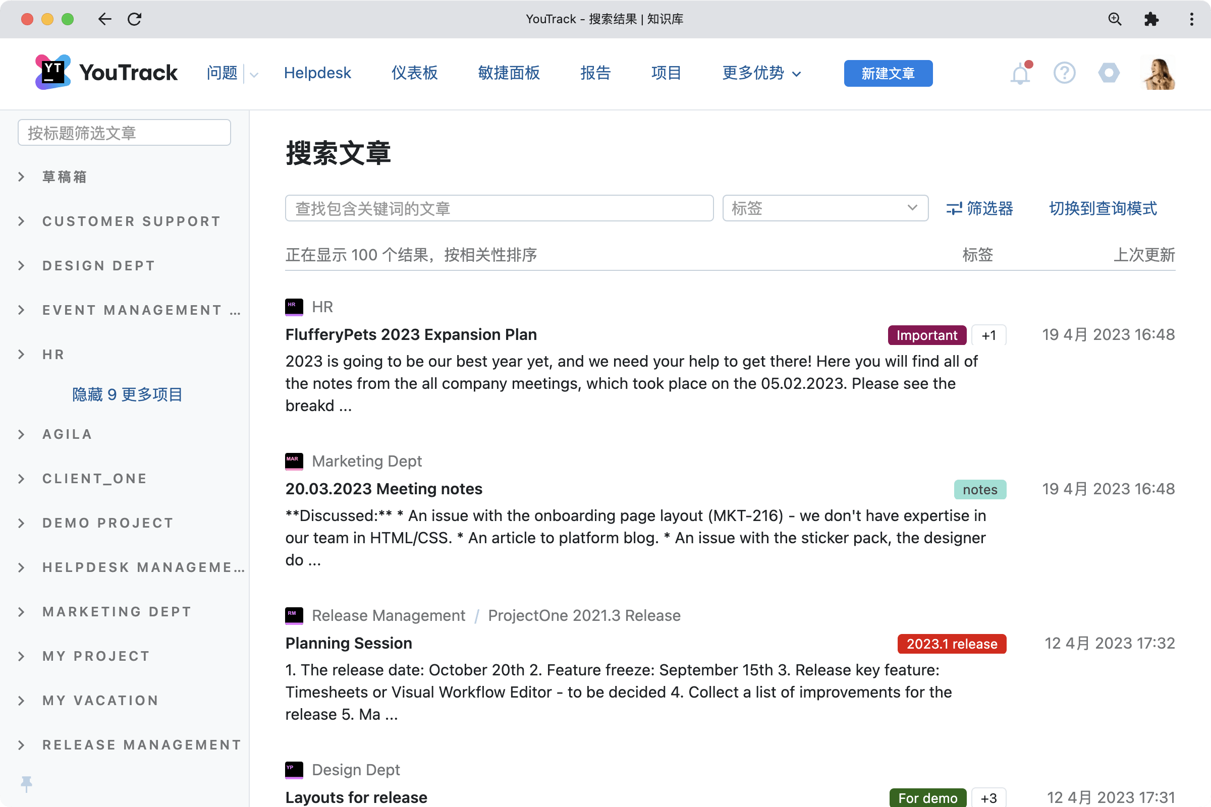YouTrack 的其他改进包括知识库更新,具备标签和更强大的搜索功能,适用于内部用户和访问公共知识库的客户。