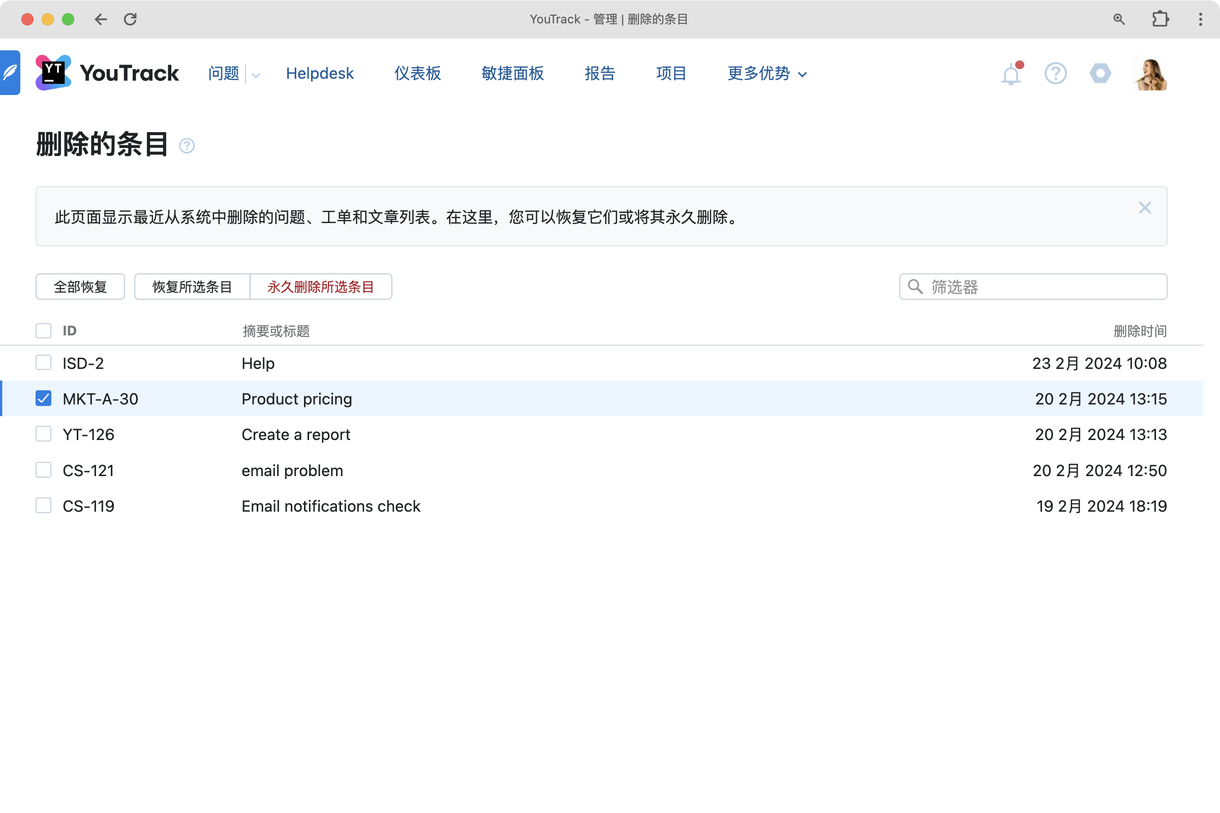 有时,重要的问题、工单或文章会被无意删除。 现在,在删除后两周内,管理员可以轻松恢复已删除内容。 此外,如果是有意删除,您现在可以将其永久移除以释放存储空间。 您还可以检查通知和活动流来及时了解删除或恢复的条目。