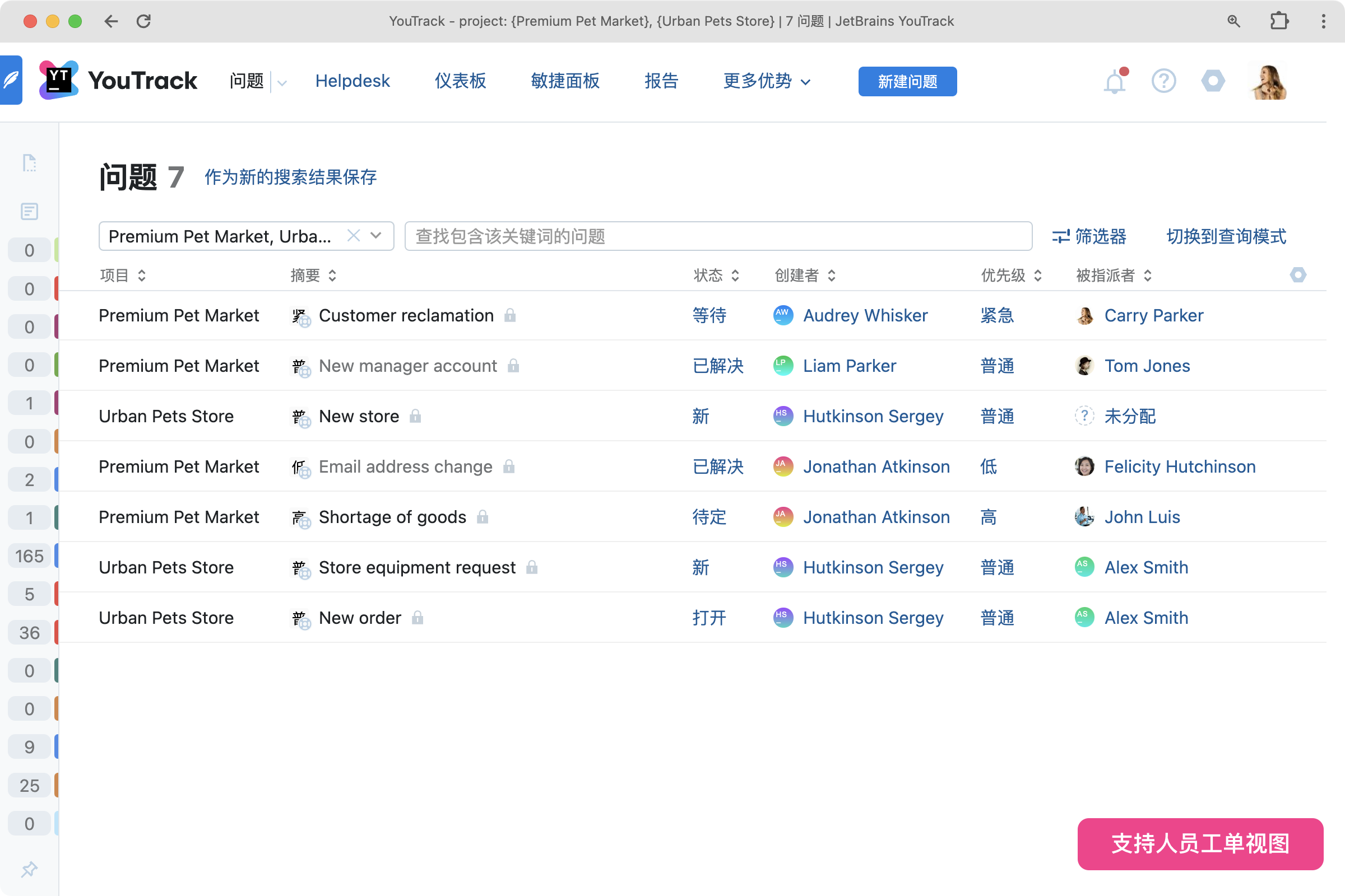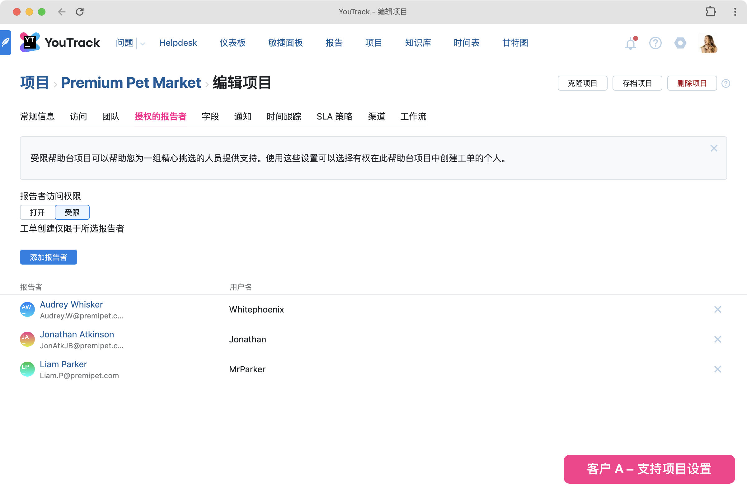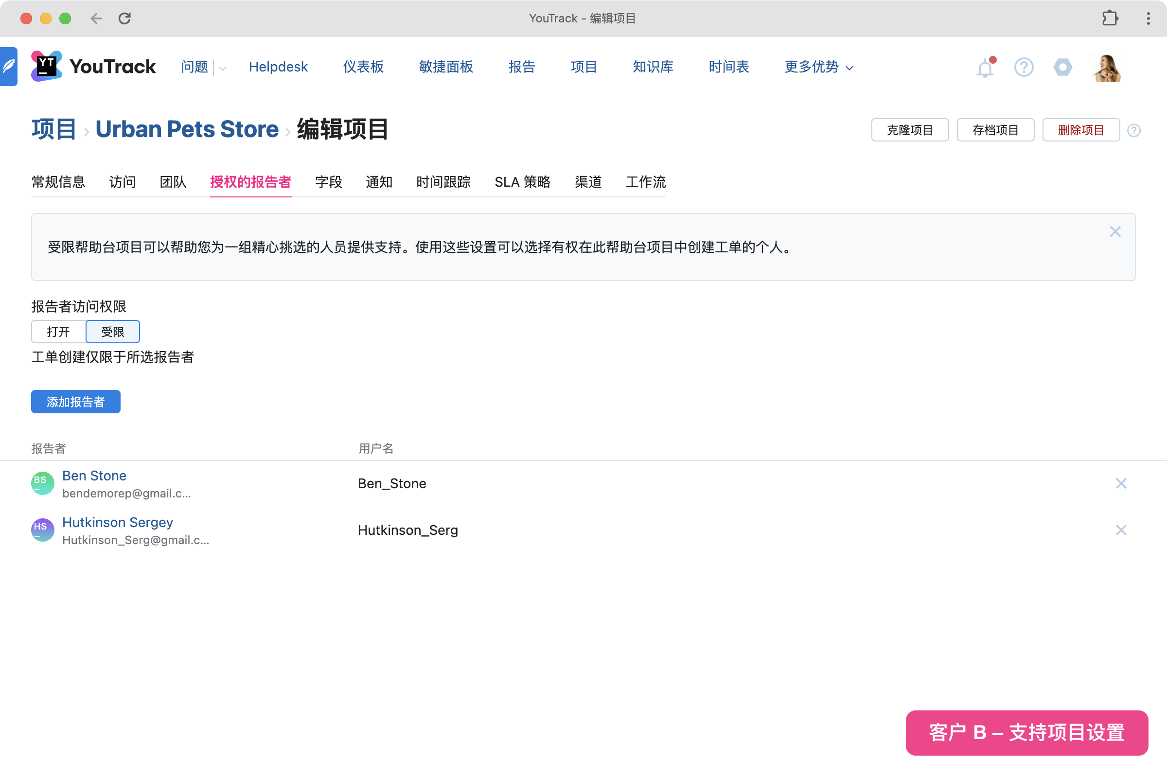 现在,您可以将每个帮助台项目限制为仅对特定报告者可见。 这意味着来自一个项目的报告者将无法访问您限制给另一组报告者的帮助台项目中的工单、在线工单提交表单和知识库文章。 这项功能为使用同一 YouTrack 实例处理多个帮助台项目(包括管理对各种产品或客户组织的支持)的支持团队而设计。