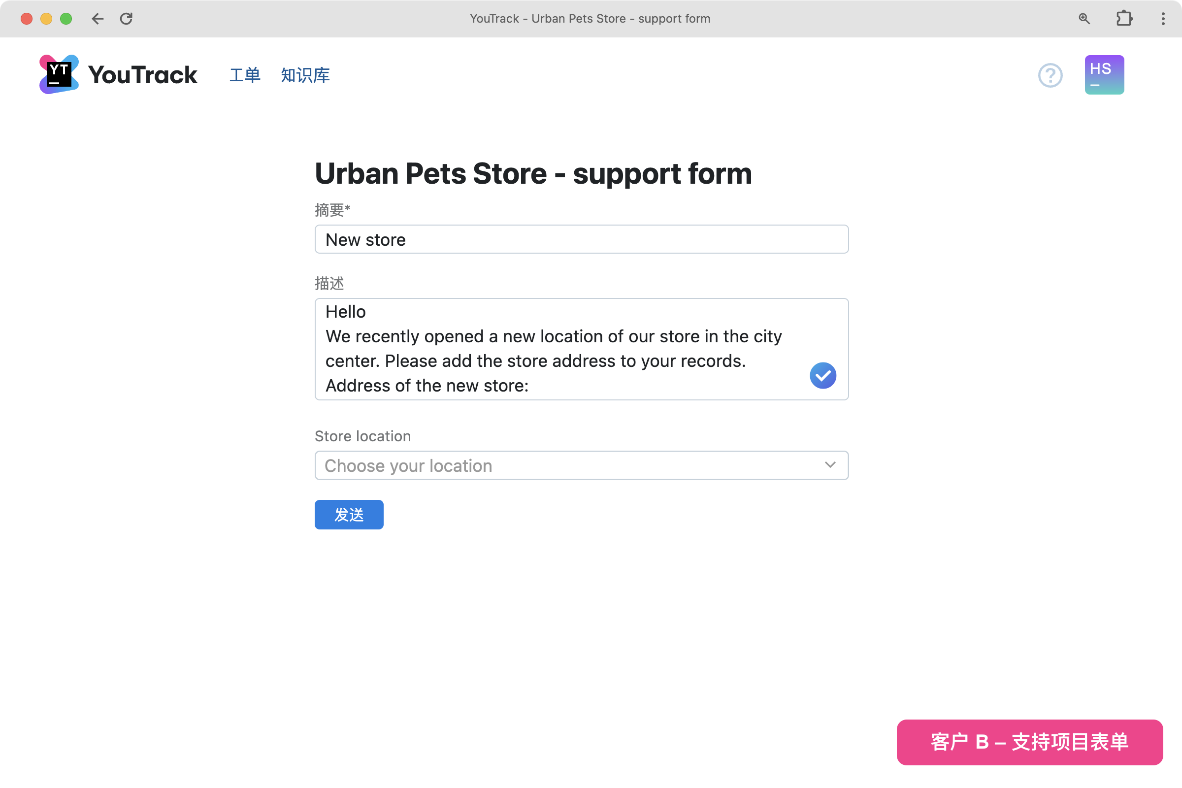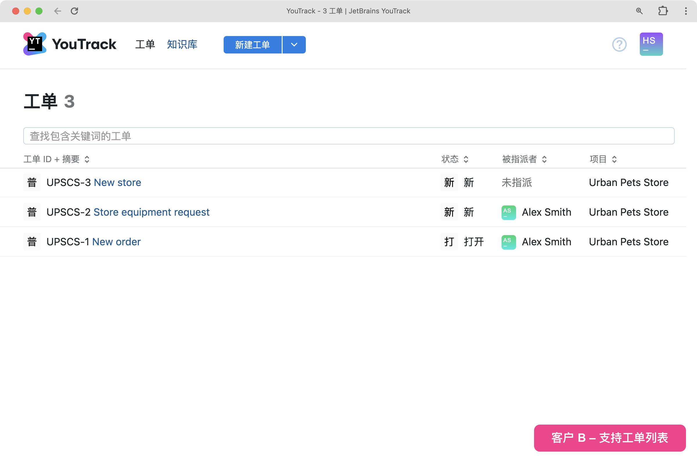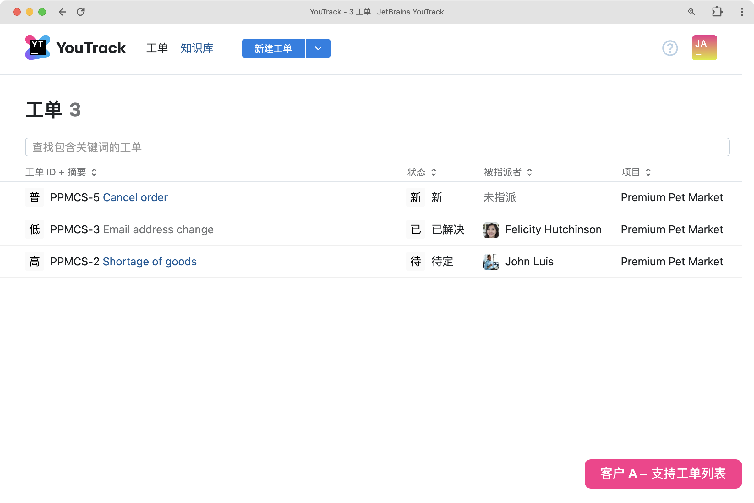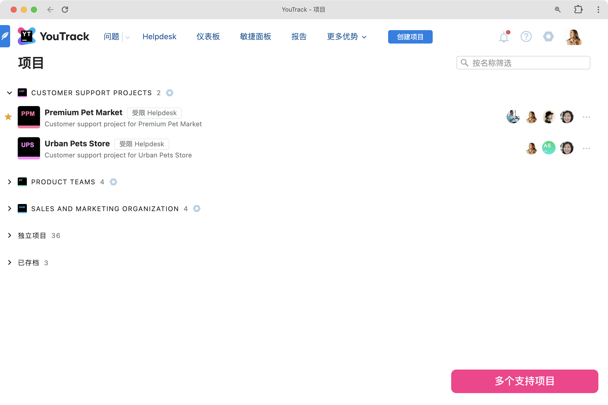 现在,您可以将每个帮助台项目限制为仅对特定报告者可见。 这意味着来自一个项目的报告者将无法访问您限制给另一组报告者的帮助台项目中的工单、在线工单提交表单和知识库文章。 这项功能为使用同一 YouTrack 实例处理多个帮助台项目(包括管理对各种产品或客户组织的支持)的支持团队而设计。