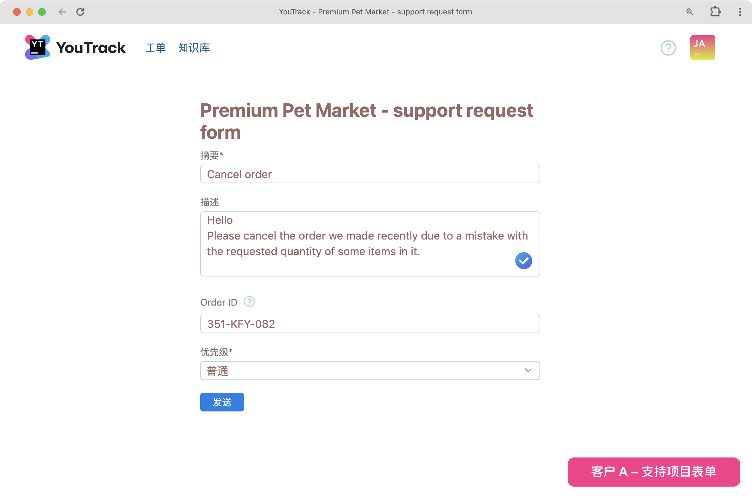 在 YouTrack 中收到工单后,摘要将通过工单提交表单或电子邮件主题创建。 支持人员现在可以编辑工单摘要,使其更易于理解和后续回顾。